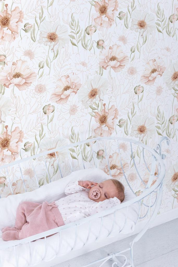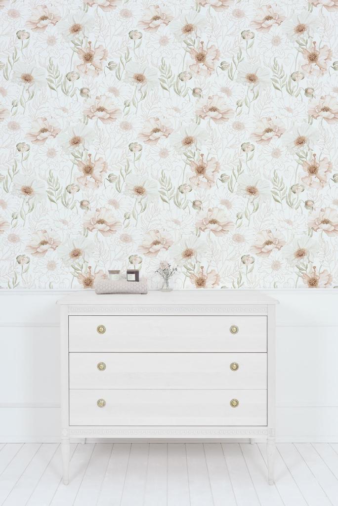 Een sfeervol en rustgevend bloemenpatroon voor een warm interieur Ons Islandic Poppies vliesbehang met bloemenprint brengt een zachte, kalme sfeer in elke ruimte. De subtiele klaprozen in zachte poederroze en warme beige tinten doen denken aan een fris bloemenveld. Dit tijdloze ontwerp past perfect in een kinderkamer, babykamer, knusse woonkamer of inspirerende werkplek. Het geeft je interieur een elegante, verfijnde uitstraling met een vleugje poëzie en moderne charme.