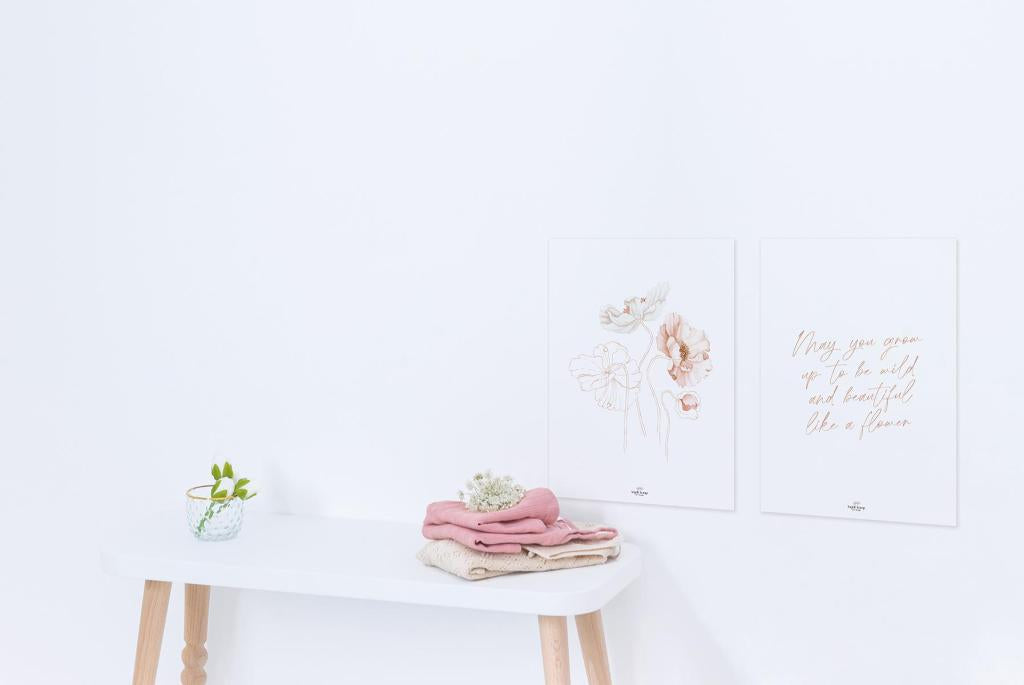 Deze set van twee posters bestaat uit een verfijnde bloemenillustratie en een inspirerende quote: “May you grow up to be wild and beautiful like a flower”. Samen vormen ze een prachtig geheel dat rust, stijl en positiviteit toevoegt aan de kinderkamer of woonkamer.
