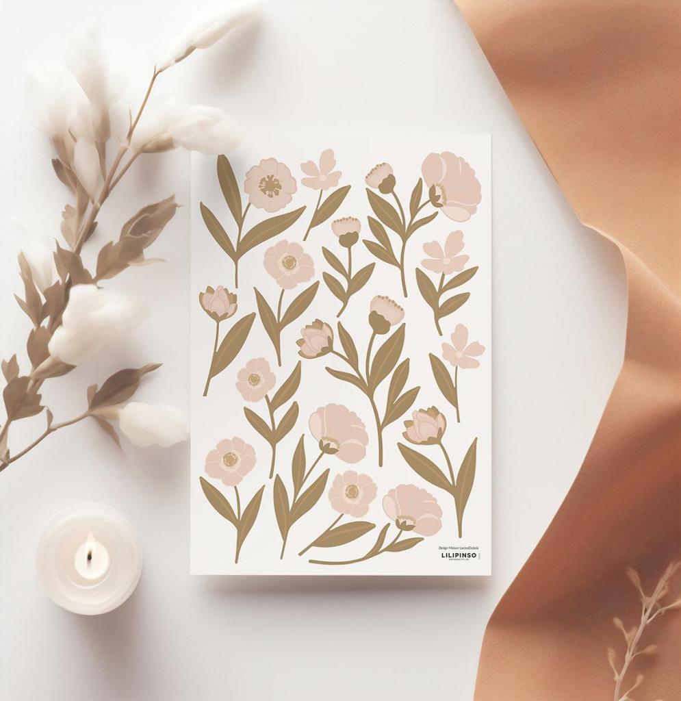 De set bestaat uit verschillende bloeiende bloemen en bladeren in warme beige- en rozetinten, perfect om een rustige en romantische sfeer te creëren. Dankzij de losse stickers kun je zelf een uniek bloemendecor samenstellen op de muur.