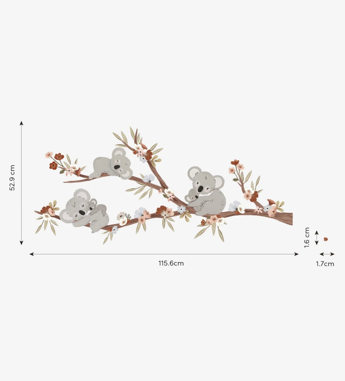 Breng een warme en lieve sfeer in de kinderkamer met deze muursticker van koala’s op een tak. De dromerige kleuren en schattige details, zoals bloemetjes en kleine koalabeertjes, maken dit ontwerp perfect voor een knusse en vrolijke uitstraling.