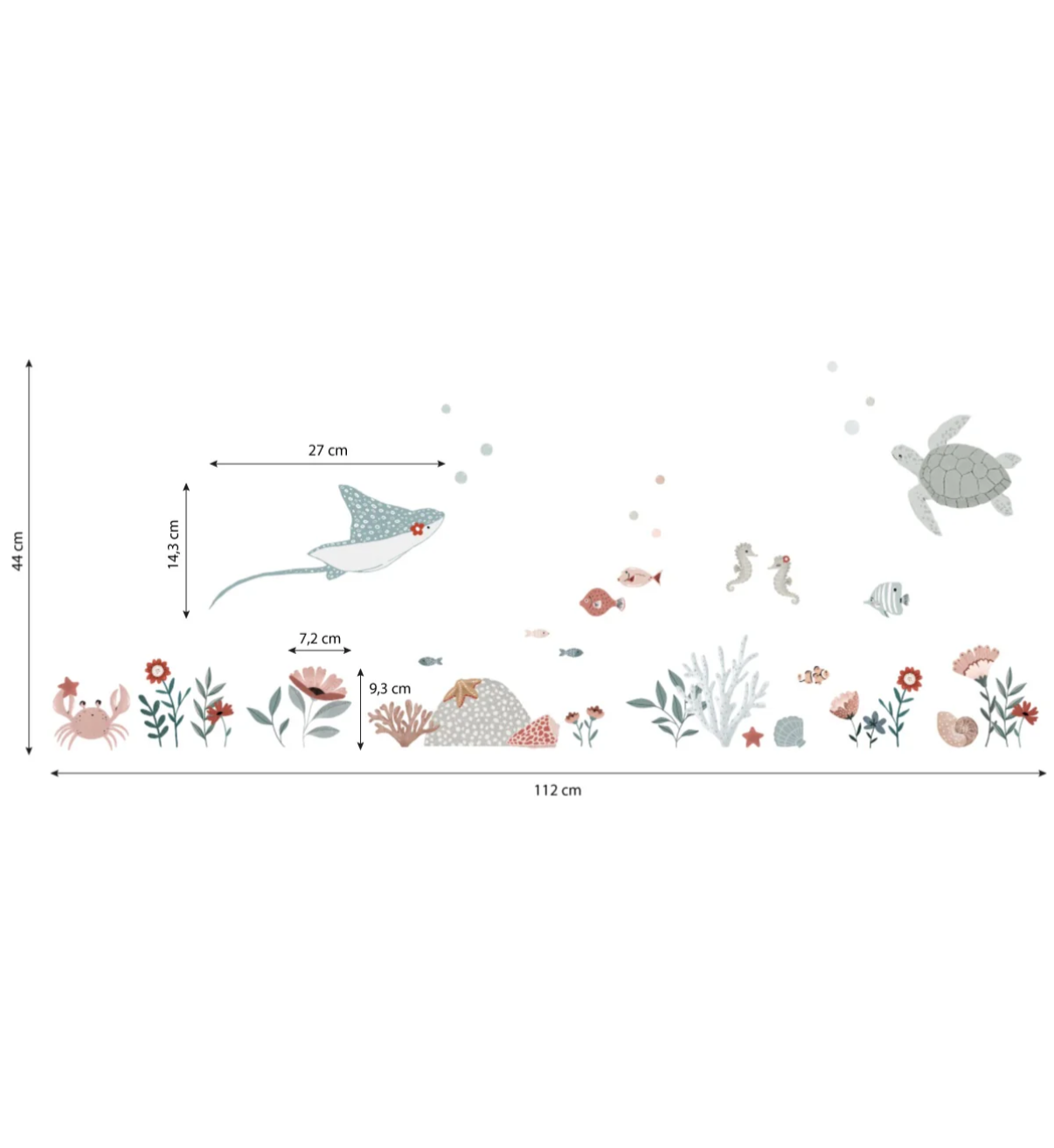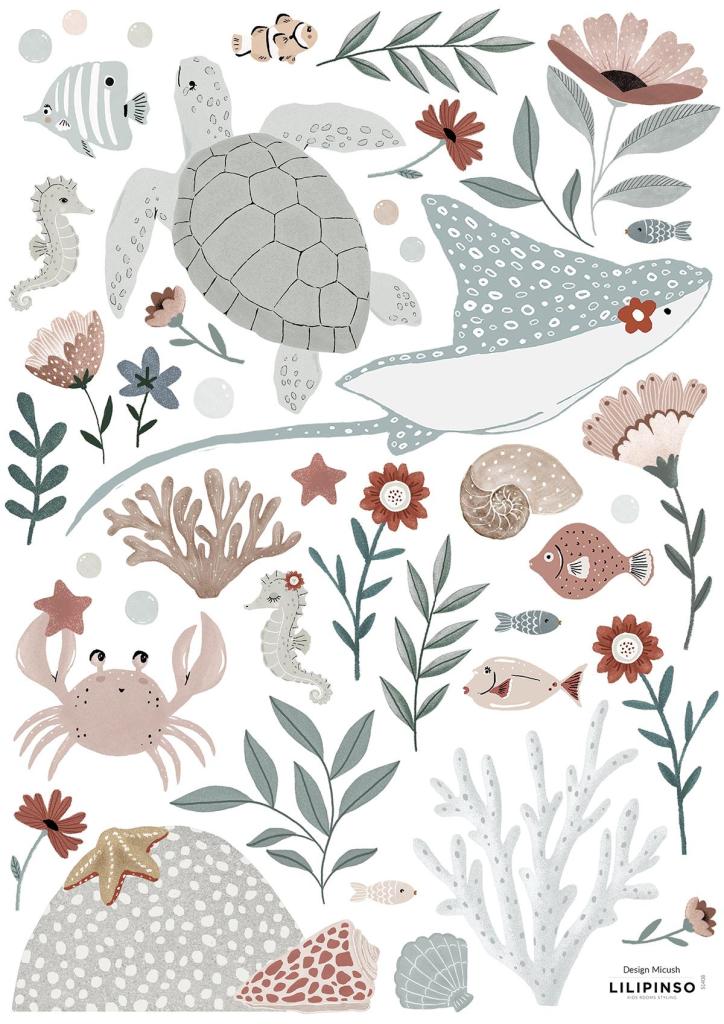 Duik in de onderwaterwereld met deze prachtige oceaan-muurstickers! De set bevat een zeeschildpad, rog, zeepaardjes, vissen, een krab, koralen, zeesterren en kleurrijke waterplanten. De zachte tinten en speelse illustraties zorgen voor een rustgevende en avontuurlijke sfeer, perfect voor een kinderkamer of speelhoek.