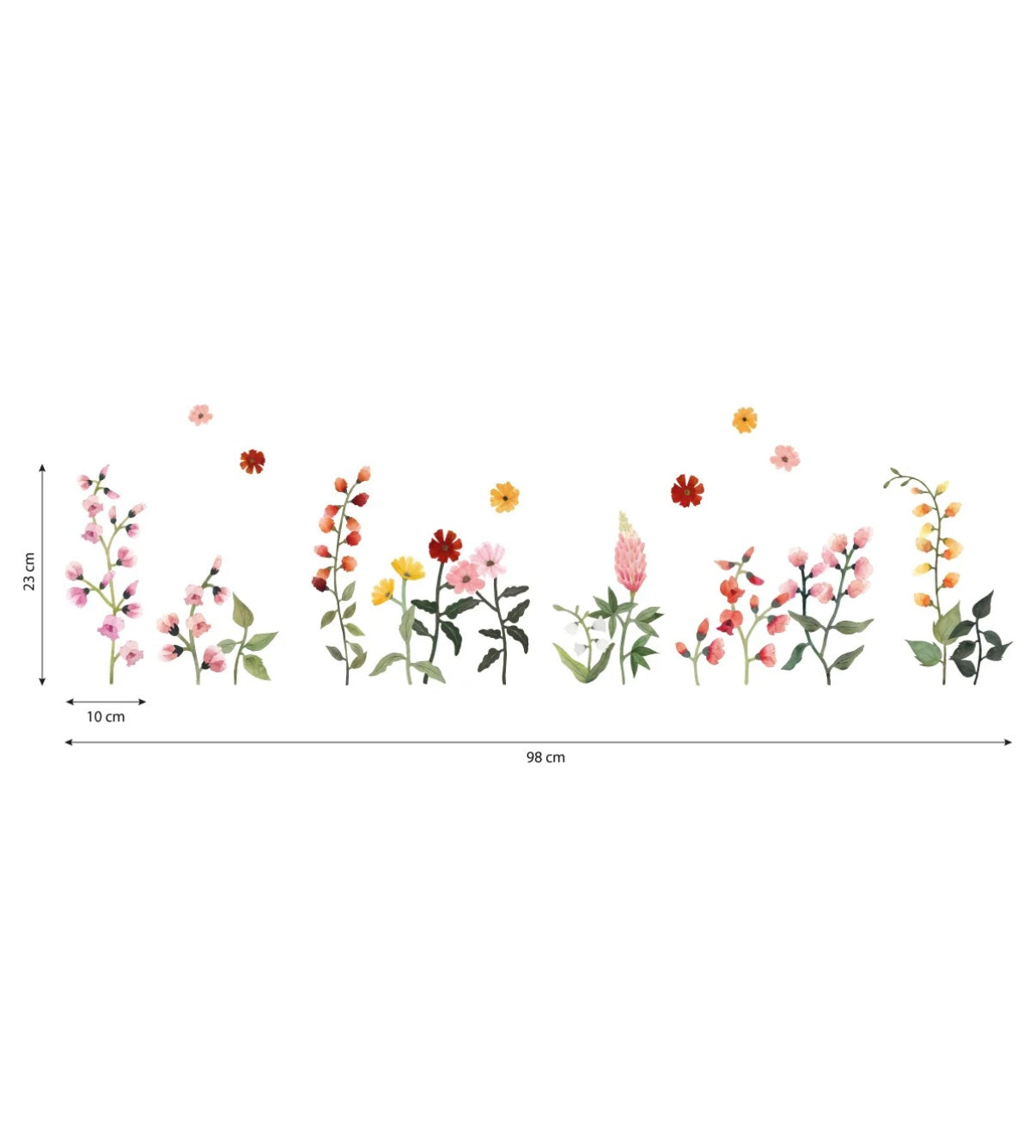 Breng kleur en vrolijkheid in huis met deze prachtige bloemenstickers! De set bestaat uit verschillende bloemen in zachte aquareltinten, zoals roze, rood, geel en oranje, gecombineerd met groene bladeren. Dankzij het losse design kun je de bloemen naar eigen wens rangschikken en een speels bloemenveld creëren op de muur.