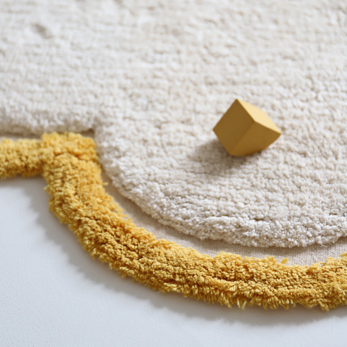 Het ontwerp is eenvoudig maar betoverend. De afgeronde, organische vorm van het wolkje geeft de ruimte een vriendelijke en luchtige uitstraling, terwijl de gele accentrand zorgt voor een frisse, optimistische sfeer. Het zachte oppervlak voelt heerlijk comfortabel aan onder blote voeten en is perfect geschikt als speel- of kruipplek voor kleine kinderen.