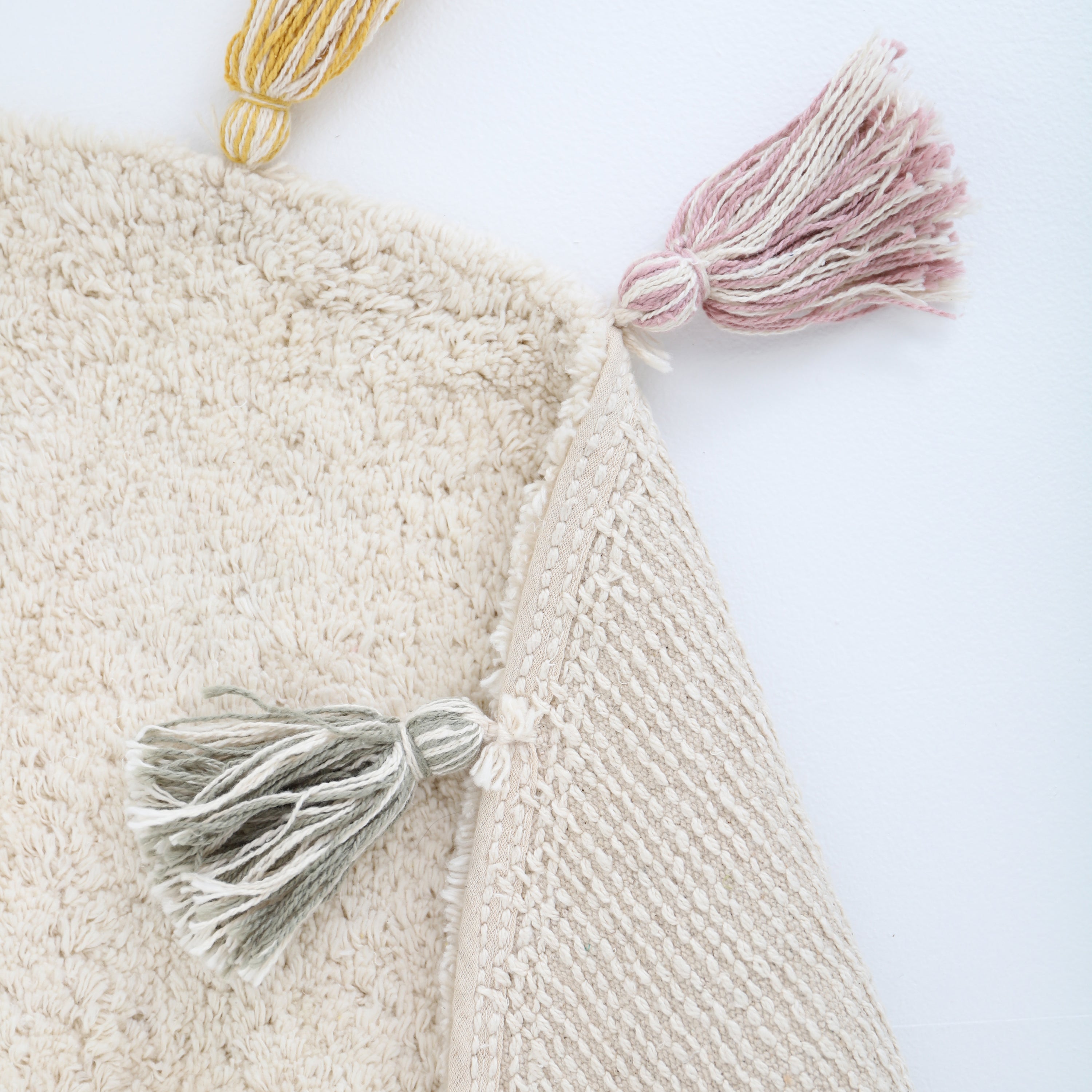 Dit vrolijke vloerkleed tovert elke ruimte om tot een plek vol warmte en speelsheid. Het ronde ontwerp met een regenboog in zachte tinten groen, oker en roze brengt een harmonieuze en vrolijke sfeer in de kinderkamer. De natuurlijke kleuren stralen rust uit, terwijl de kleurrijke accenten een vleugje optimisme toevoegen – perfect voor kleine dromers en ontdekkers.